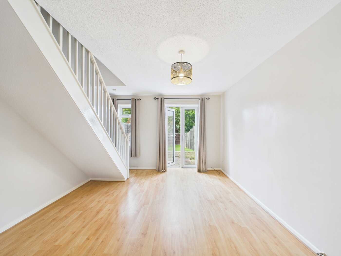 The property offers a thoughtful layout, ensuring a comfortable living experience. It features an inviting entrance hallway that sets the tone for the home, while the living area is spacious and filled with natural light, with French doors leading to the rear garden. The contemporary kitchen includes a dark wood laminate flooring and is equipped with modern integrated appliances and a reliable combi-boiler, also this kitchen provides two large spaces for washing machines and tumble dryers. There are two well-proportioned bedrooms offering ample space for relaxation, and a modern bathroom suite with bright features, really opening up the spaces upstairs.