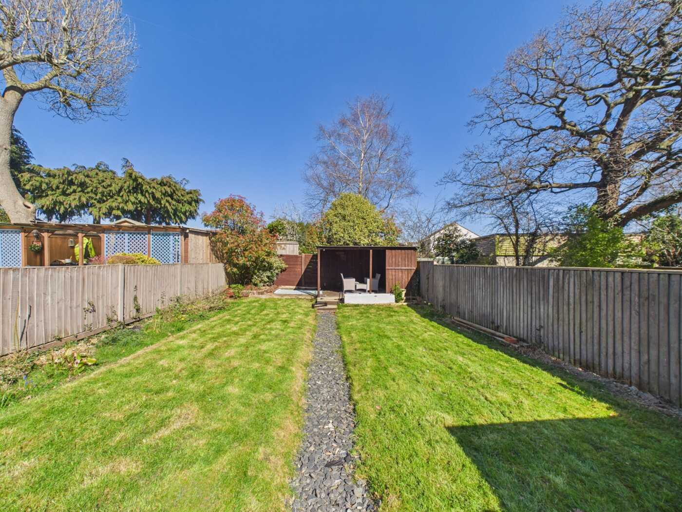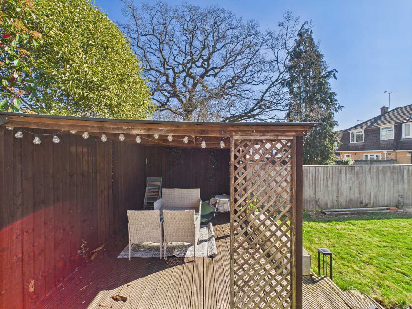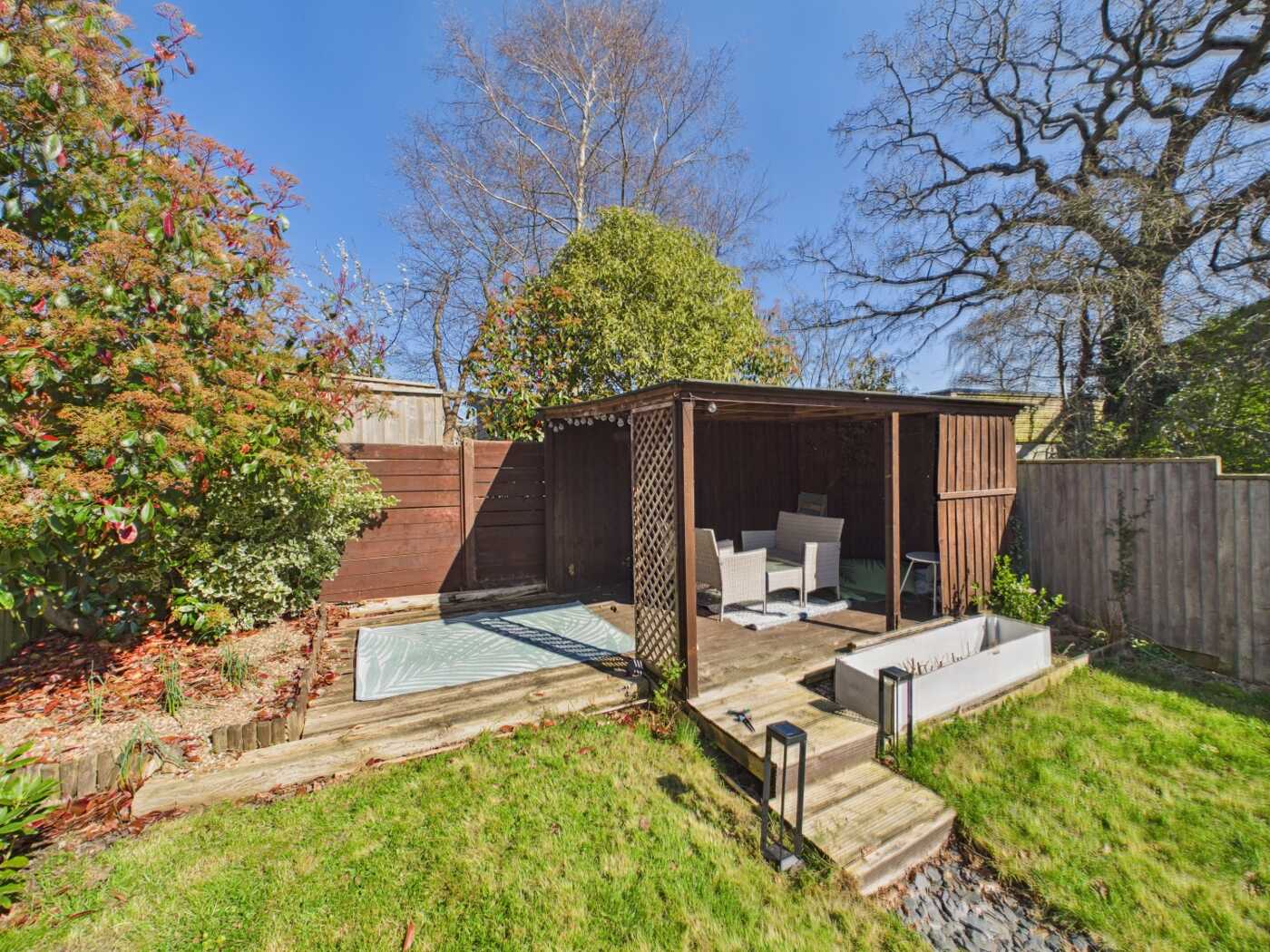 Externally, the property boasts a generous garden that is perfect for outdoor living. It includes a patio seating area, a lush lawn, and raised decking adorned with a pergola, offering a peaceful retreat for relaxation or socialising.