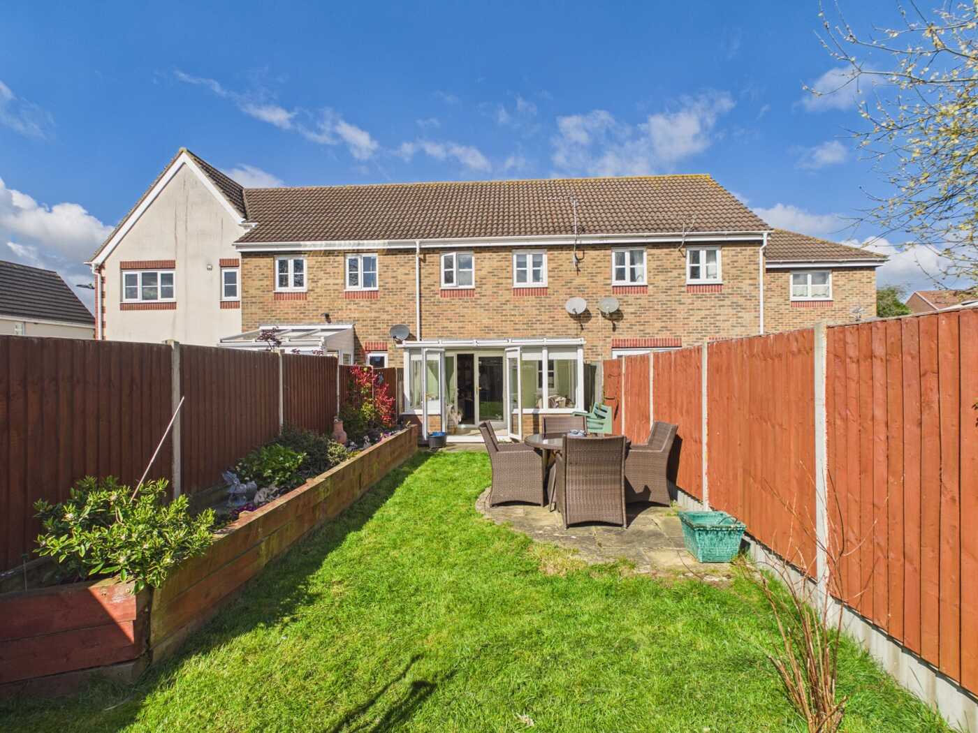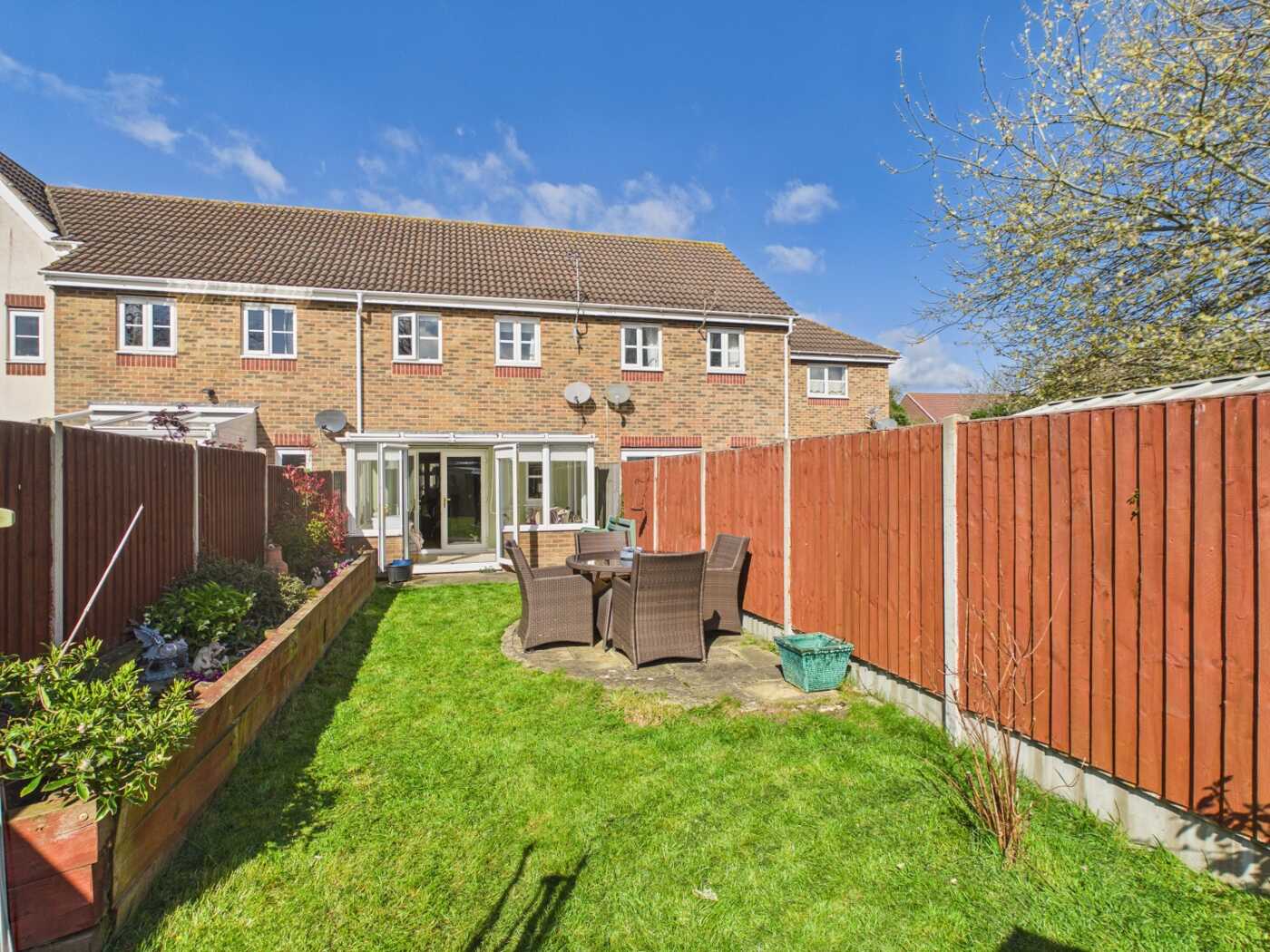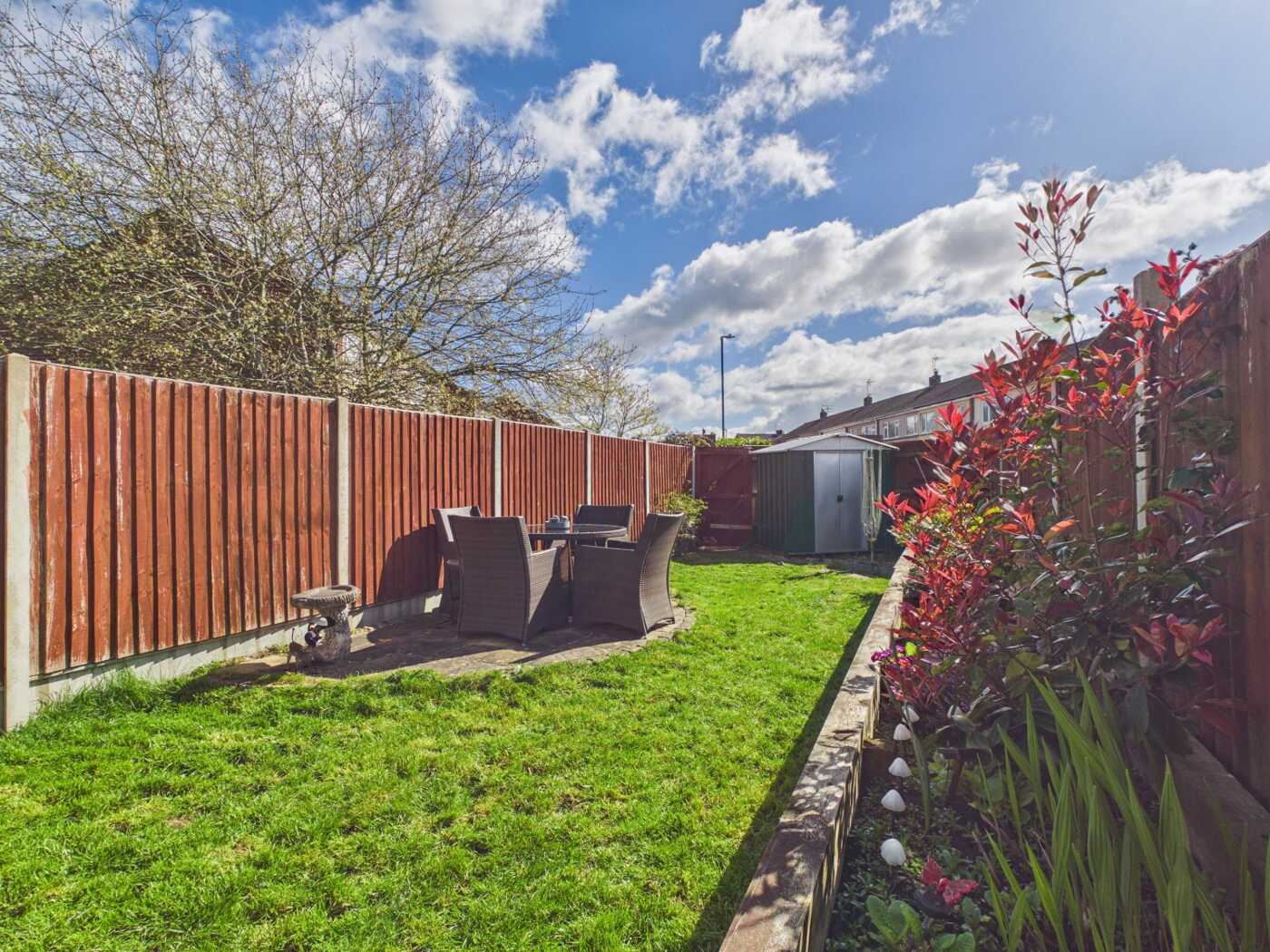 Externally, the property features a well-maintained and generously sized garden. It includes a lawn, a patio seating area ideal for outdoor dining, and raised flower beds. The property benefits from allocated parking, ensuring convenience for residents.